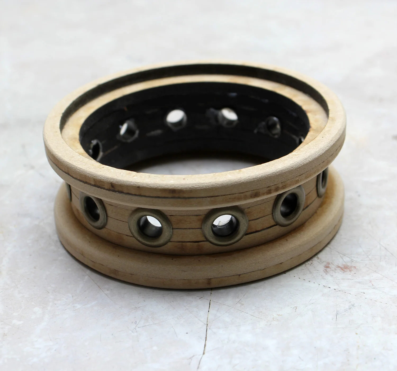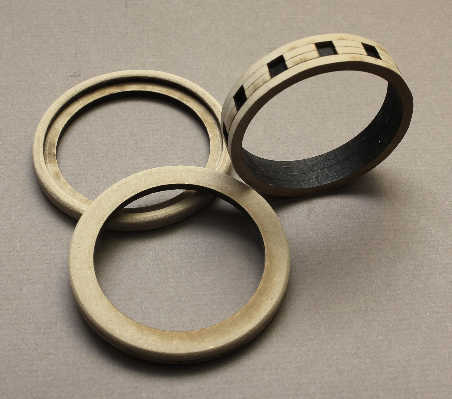 I began the construction by lasering several rings in fiberboard. The top and bottom are identical, and include a recessed area to receive the vacuum formed parts.