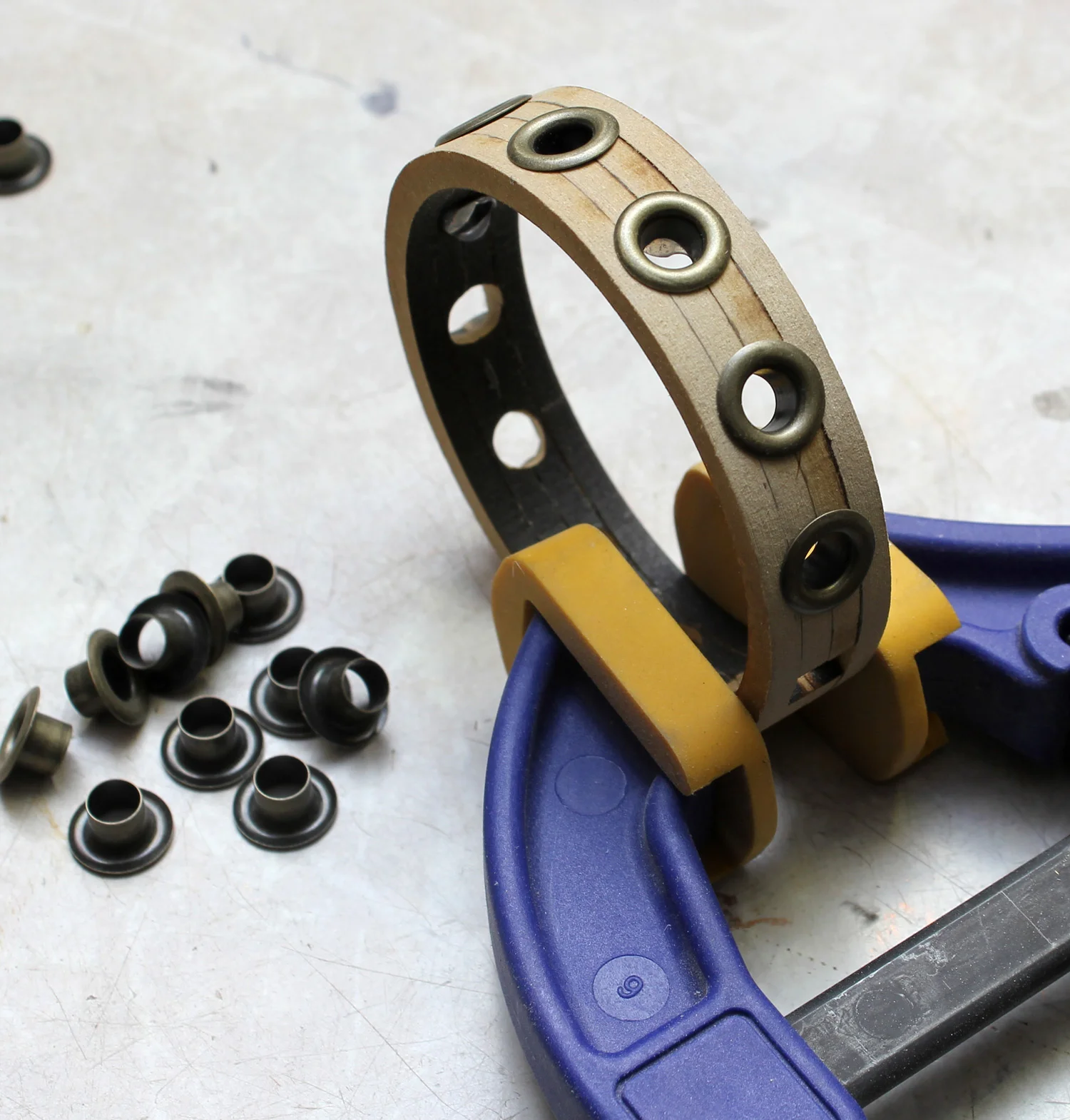 I drilled out the blackened squares to accept brass grommets, which would form the intake portals of the respirator. I epoxied the grommets in place, six at a time so that they would stay in place.