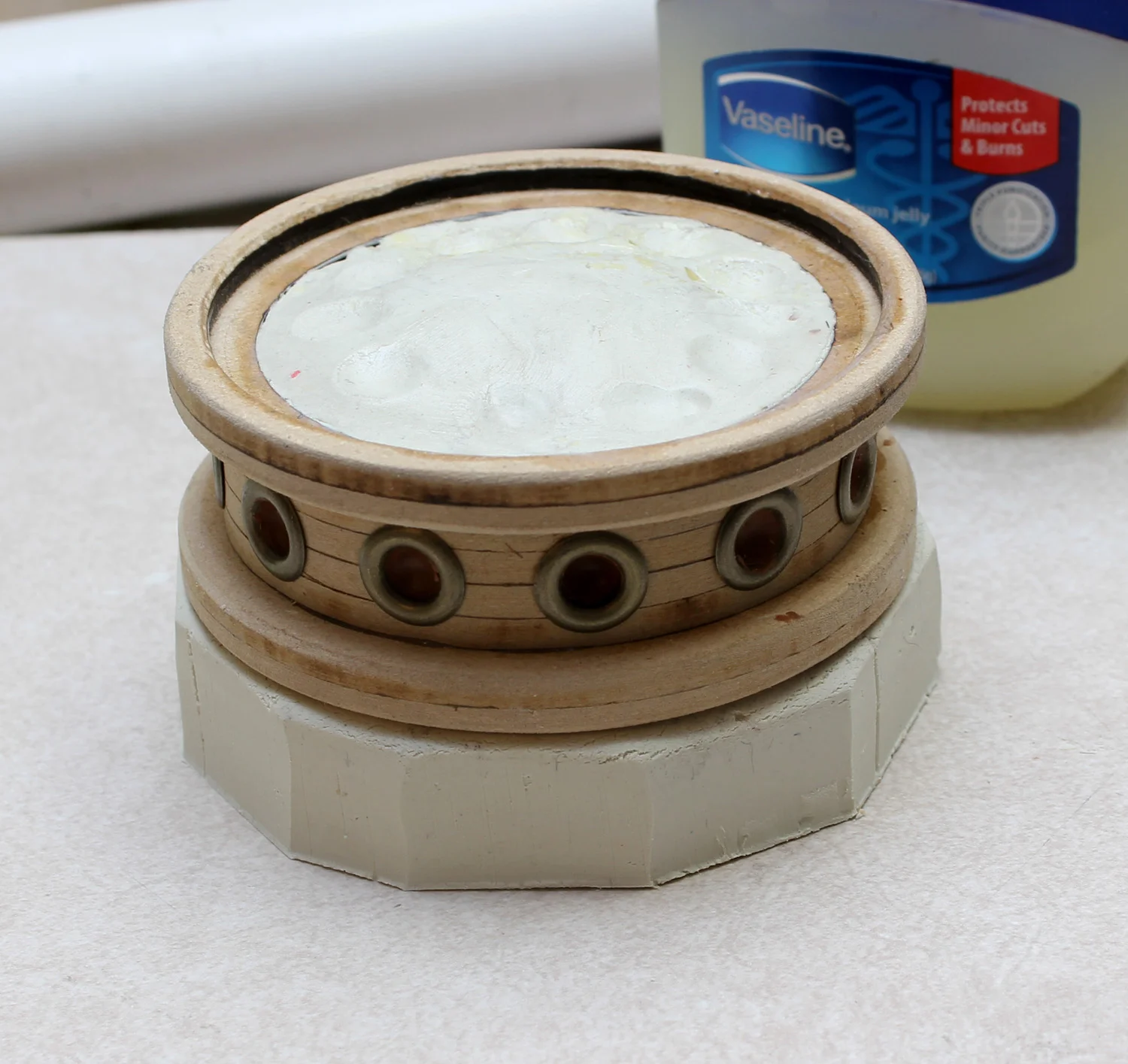 Then I place the fiberboard model on top of a bed of the clay, and trimmed away the excess with a large knife. While the clay was still warm I packed it into the interior of the model right up to the inner top side. Using a steel modeling tool I made several impressions into the top surface of the clay. This surface will align the two parts of the rubber mold.