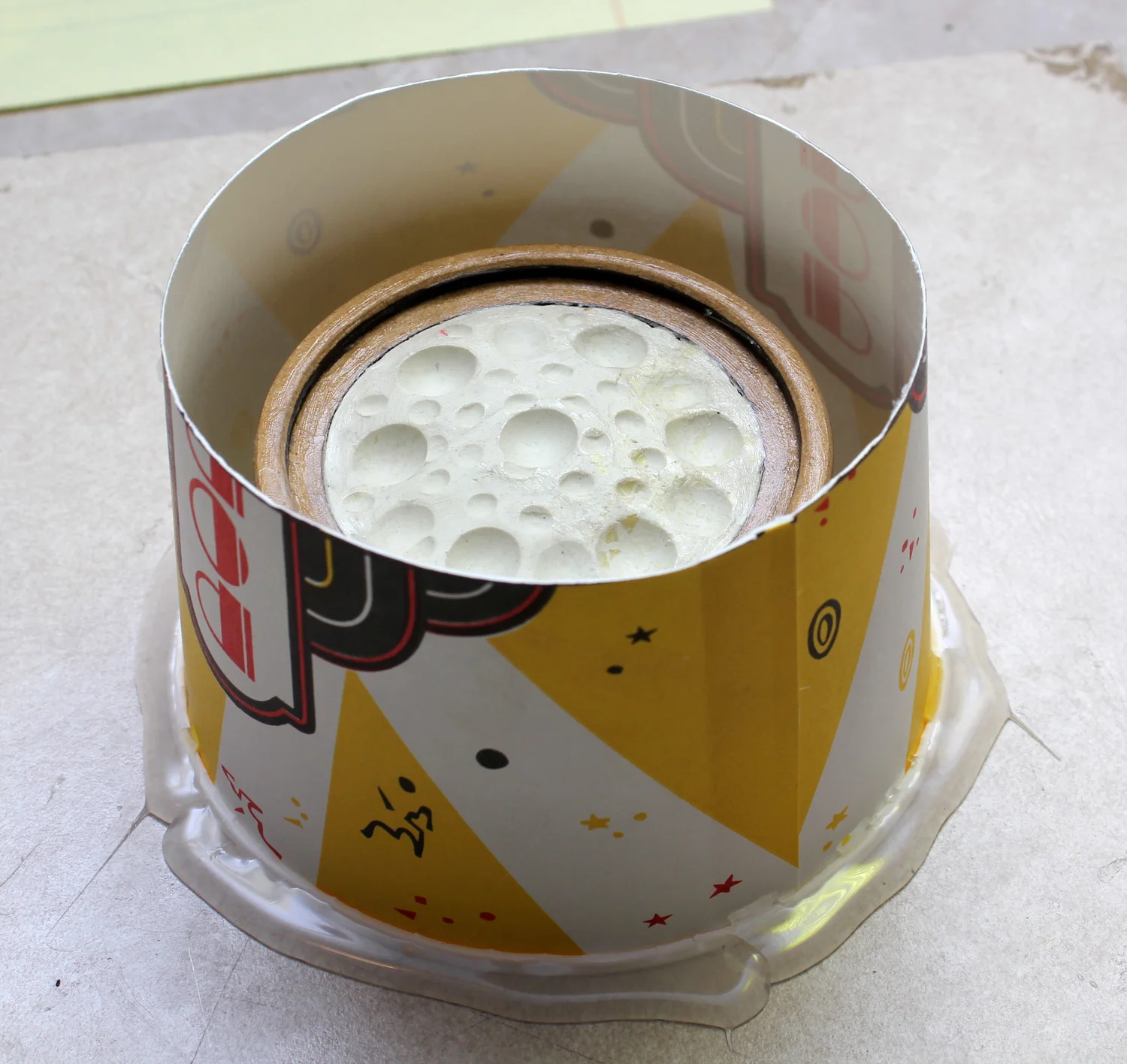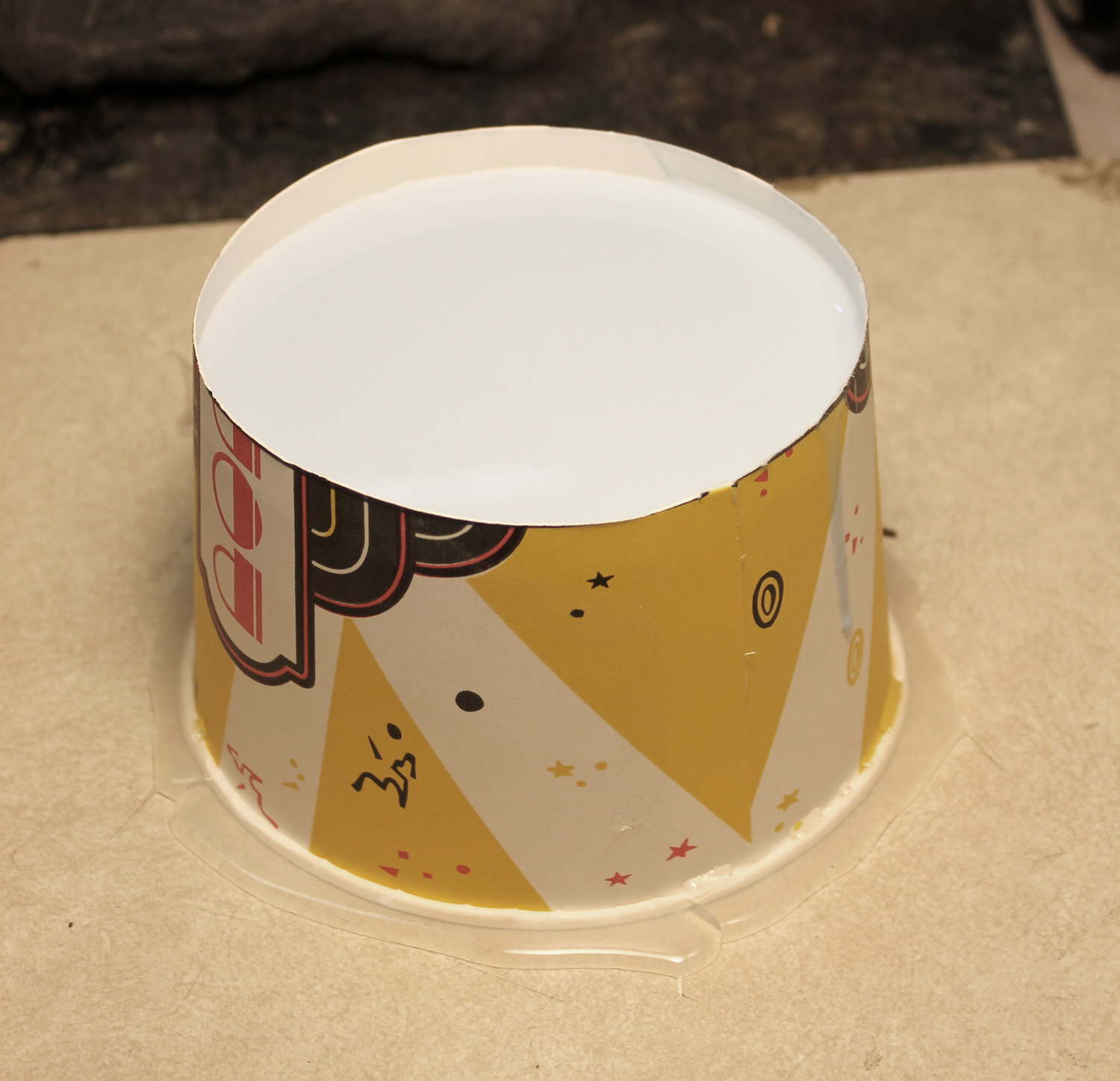 Next I took a paper popcorn cup and cut off the bottom half. I placed the top half upside down around my clayed up model, and used a hot glue gun to fasten the cup to the mounting board, ensuring that it was water-tight, as the liquid silicone rubber can escape through the tiniest of holes.
