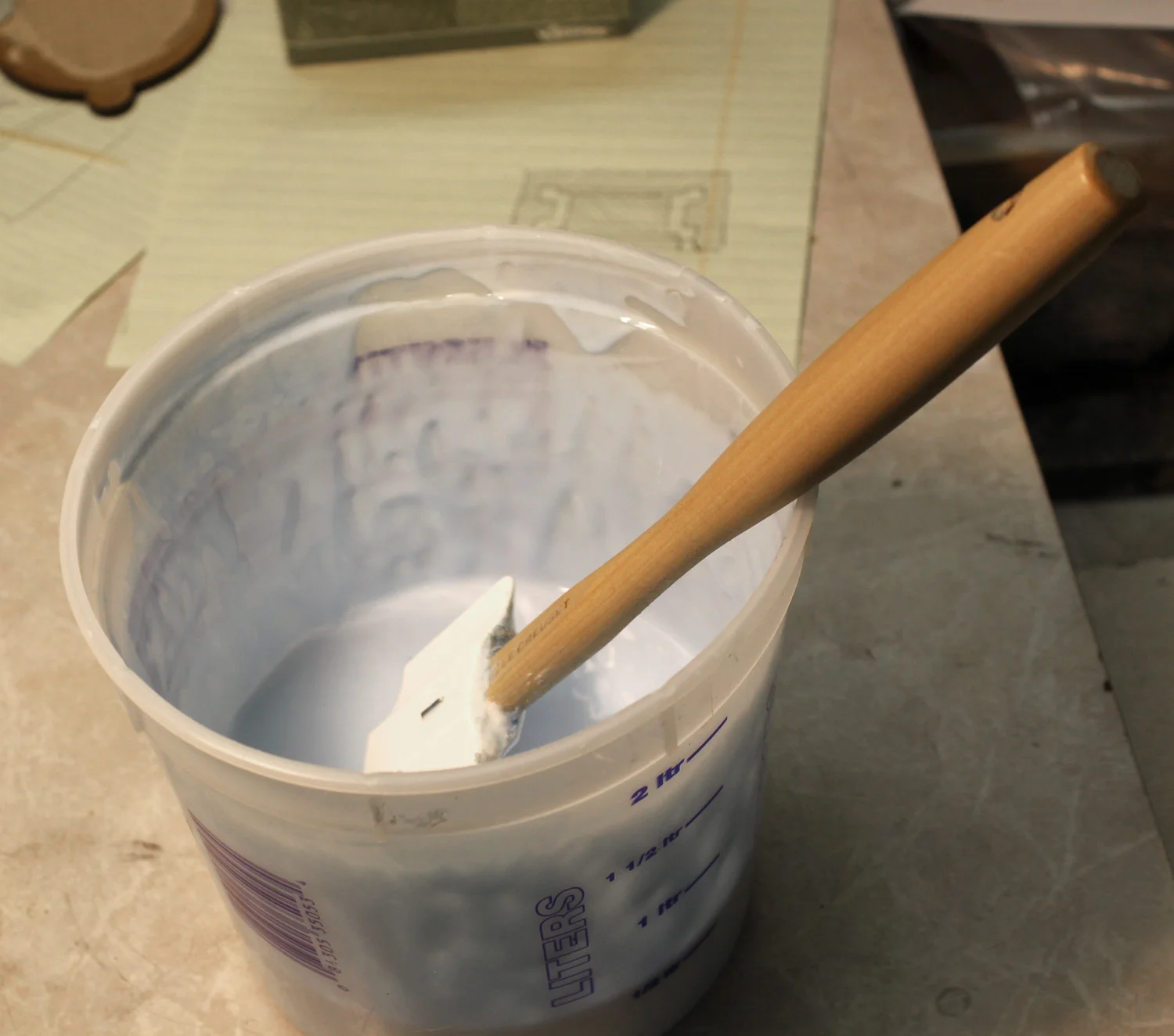 I mixed up the silicone rubber in a polyethylene bucket, one part A to ten parts of B by weight. The A side is dark blue, and the B side is white. Mixed together they formed a pale blue, quite viscous liquid. I placed the bucket in my vacuum chamber and turned on the pump, in order to draw the air bubbles out of it.