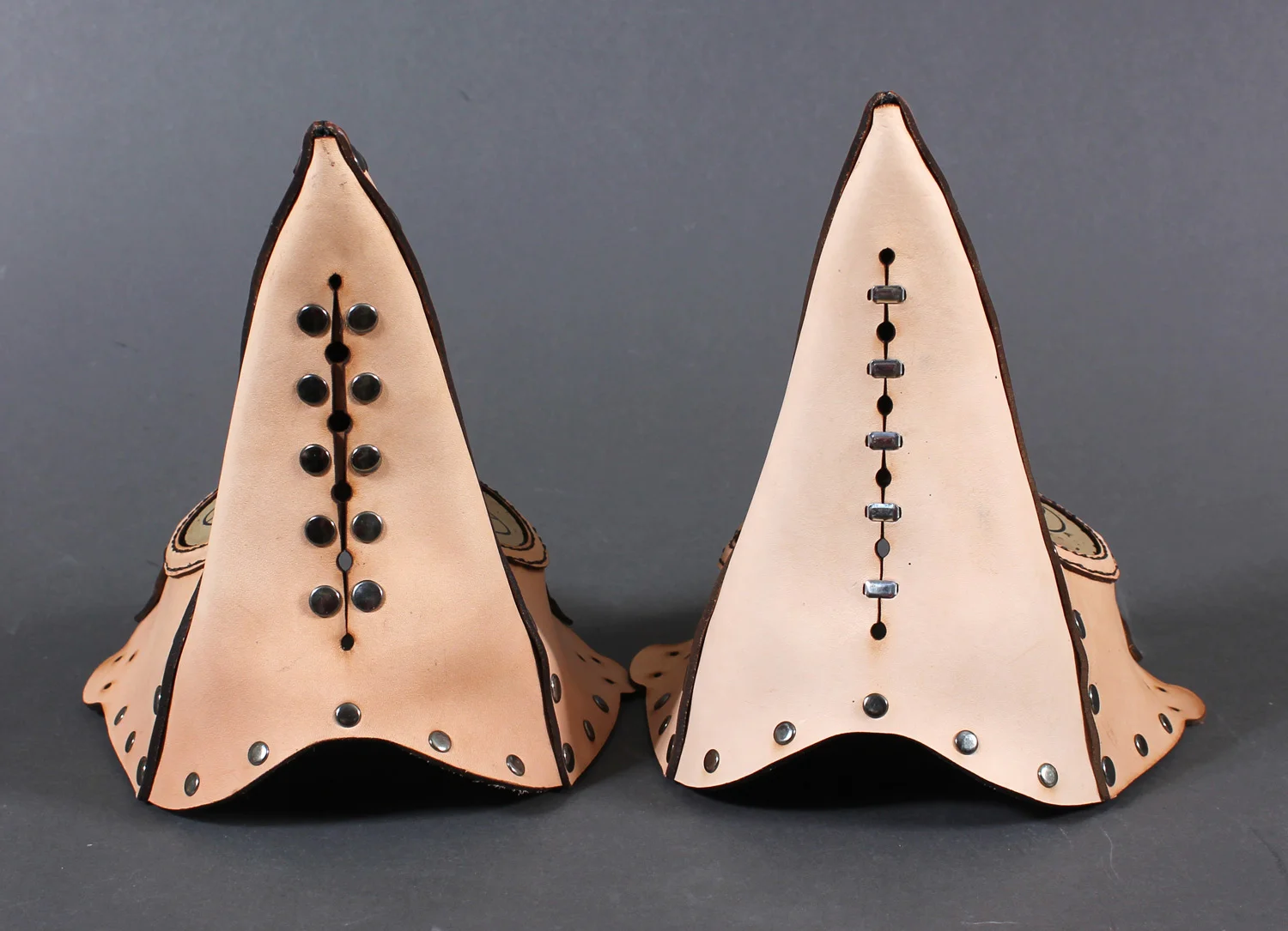 Our plague doctor masks have a dart on the bottom of the beak, and on both the Krankheit (shown below) and the longer Schnabel that dart is closed by means of a strip of leather that goes on the inside of the mask attached with two rows of rivets.