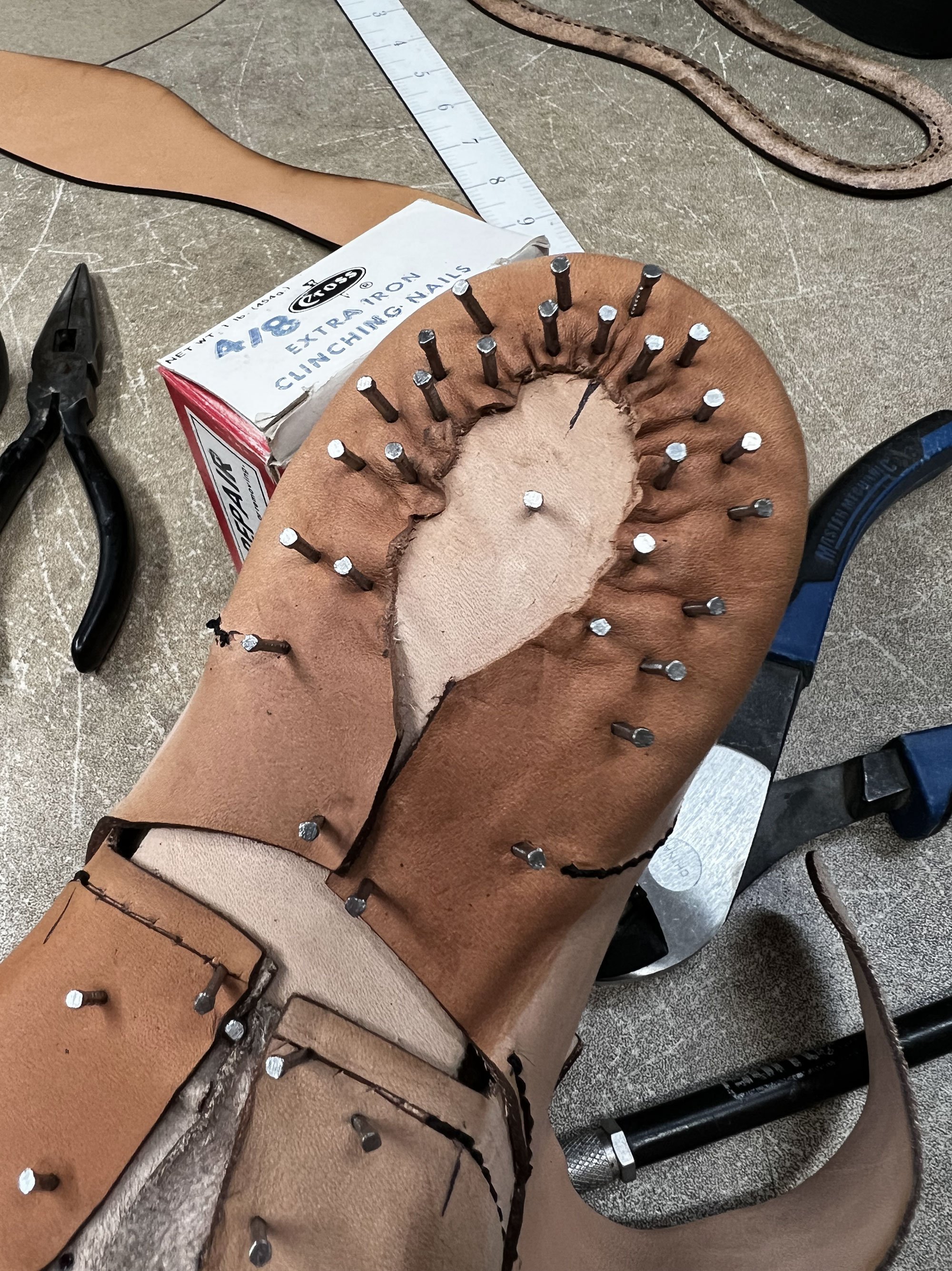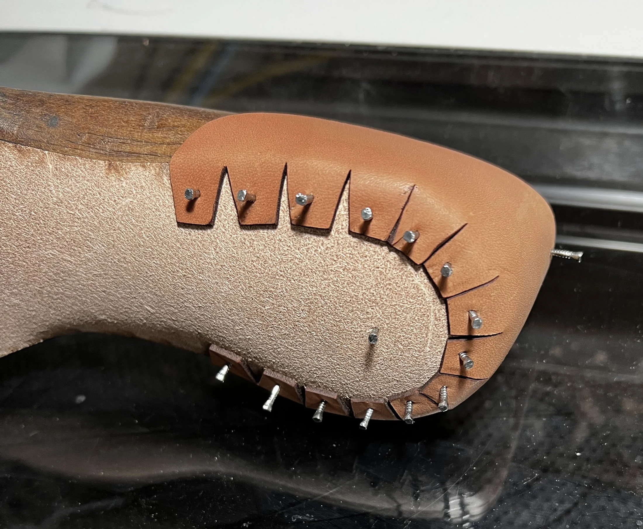 Damp 4 oz Veg Tan Counter Drying Around the Heel of the Last. Note the Clinching Nails Holding it in Place.