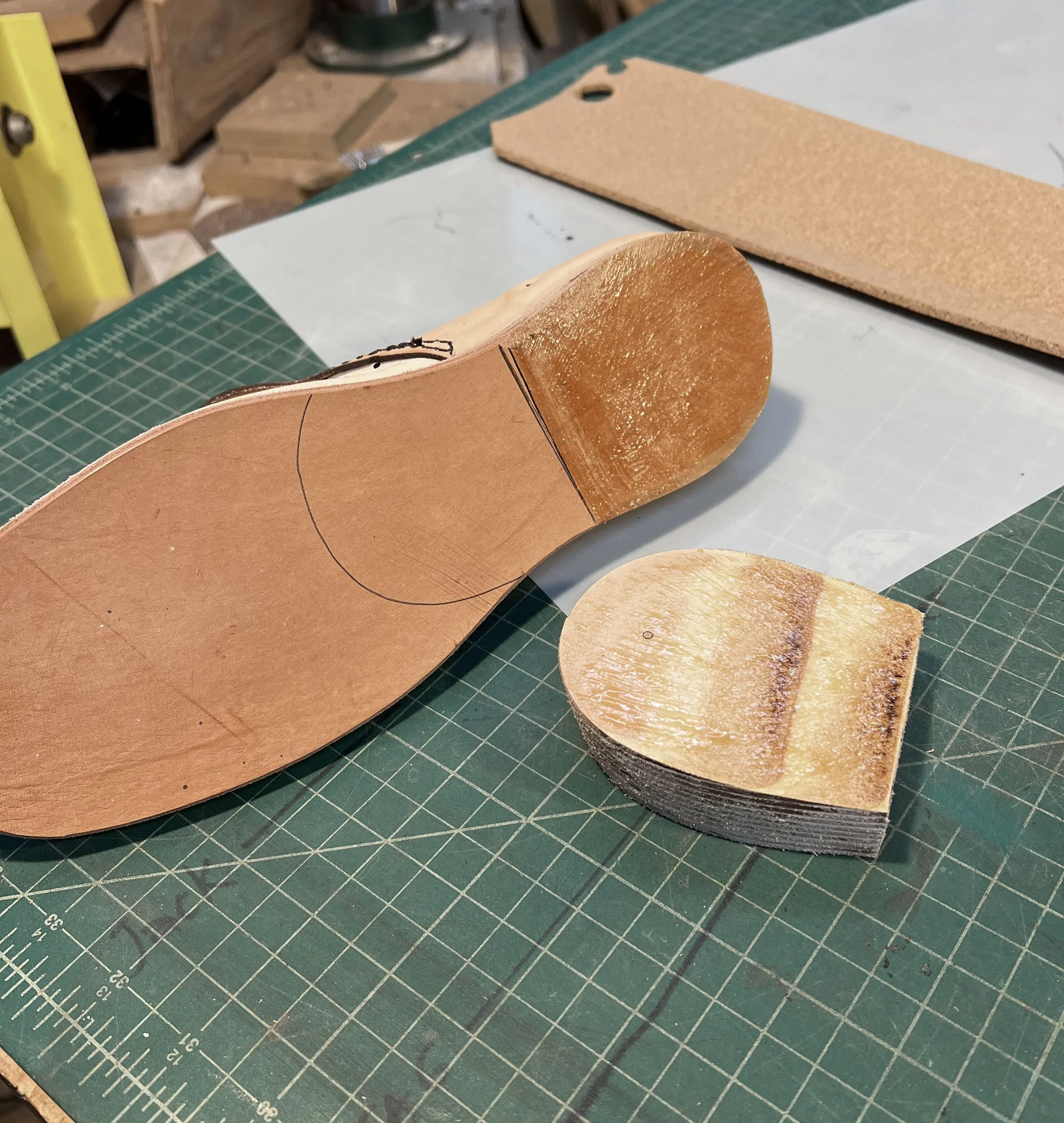 Once the cement was cured after about ten minutes, I marked where the heel would go on the bottom of the sole, scuffing up both surfaces to better hold the cement.