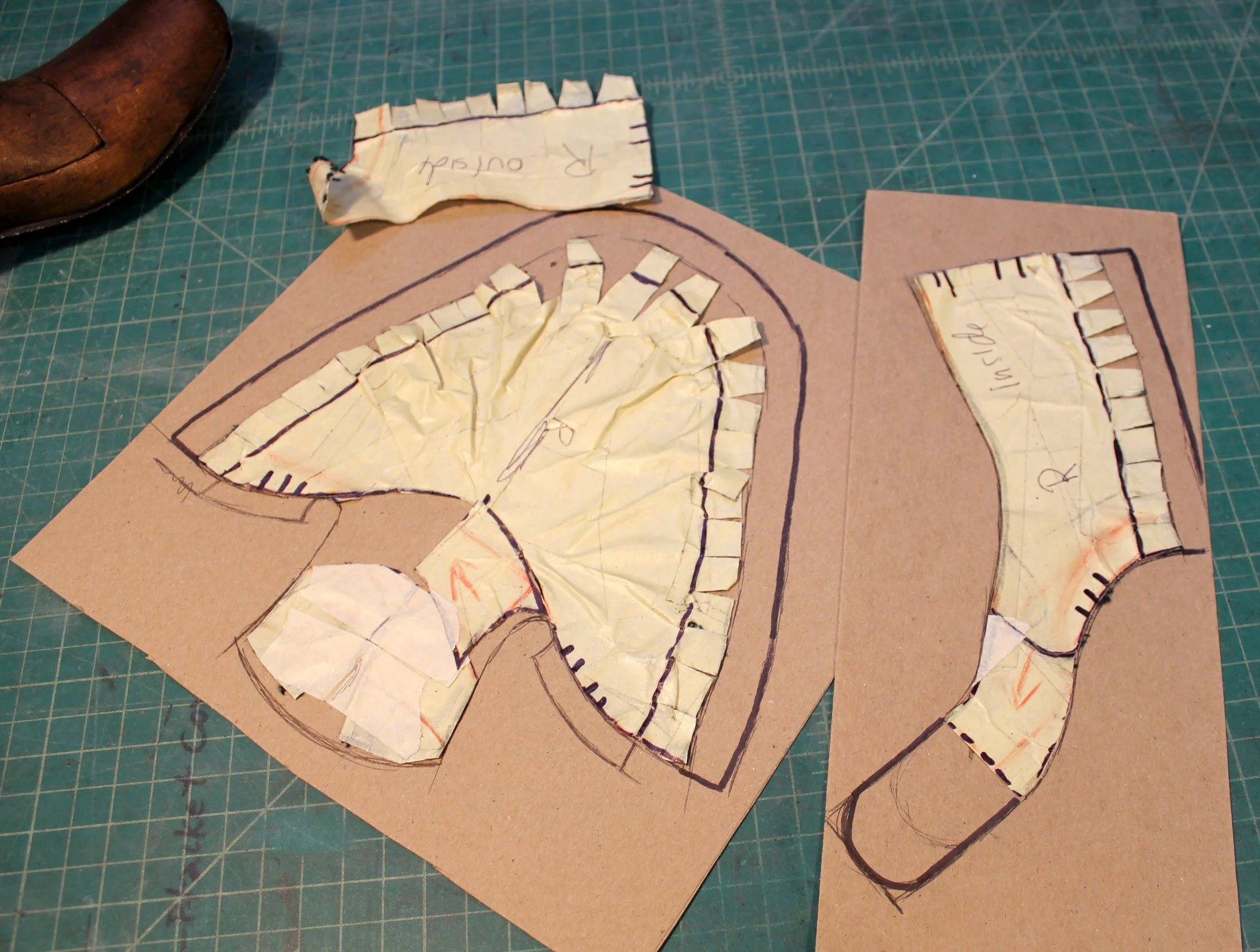 I began by covering the right wooden last in masking tape. Then I used a felt marker to delineate the two main pattern pieces: The vamp, which covers the toes, and the quarters, which covers the heel. I used an Xacto blade to cut the pattern pieces out and stuck the tape down onto chipboard. I added on a seam allowance, the straps, the tongue, and the extra leather needed to wrap around the toes and heel to get my finished patterns.