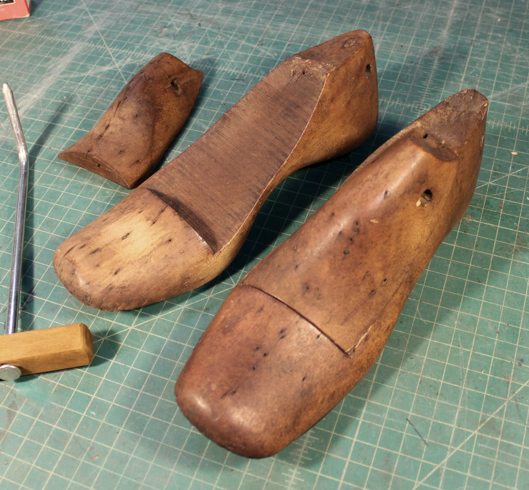 I knew that to do this properly I would need a wooden last over which the shoe would be constructed. Finding one with the square toe proved challenging, but on Etsy I discovered a listing for a pair of antique wooden lasts described as a “pilgrim shoe former”. The size was marked 5E ( I wear a 9½ US, 43 European), but the measurements given seemed quite close to my foot size. So I bought them, figuring I could alter them as needed. Note that they come in two parts, which allows them to be removed from the finished shoe.