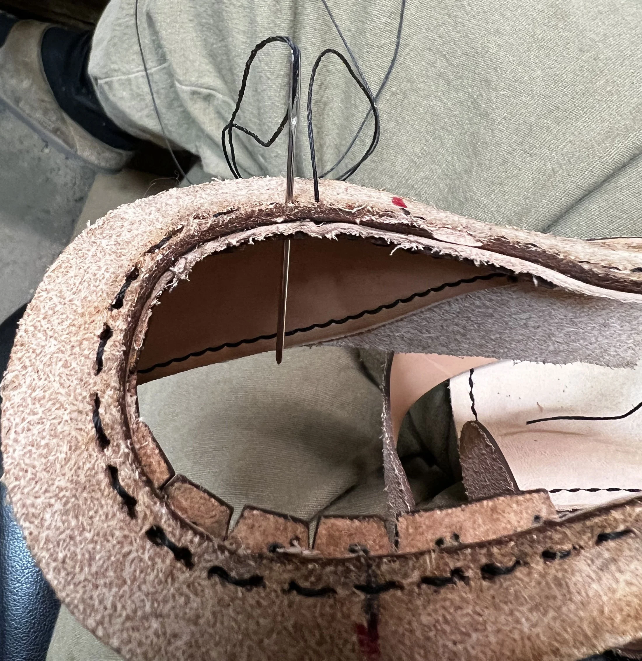 Once the uppers were dry, I cut a welt, which is a narrow strip of leather that runs around the outside of the sole, and holds the uppers to the midsole. I punched holes along its length and after cementing it down, hand-stitched it to the uppers. Next I cut the midsole out of 5-6 oz veg tan and cemented it onto the welt. Then I sewed the two pieces together using my industrial sewing machine, a Cobra Class 4 from Leather Machine Company.