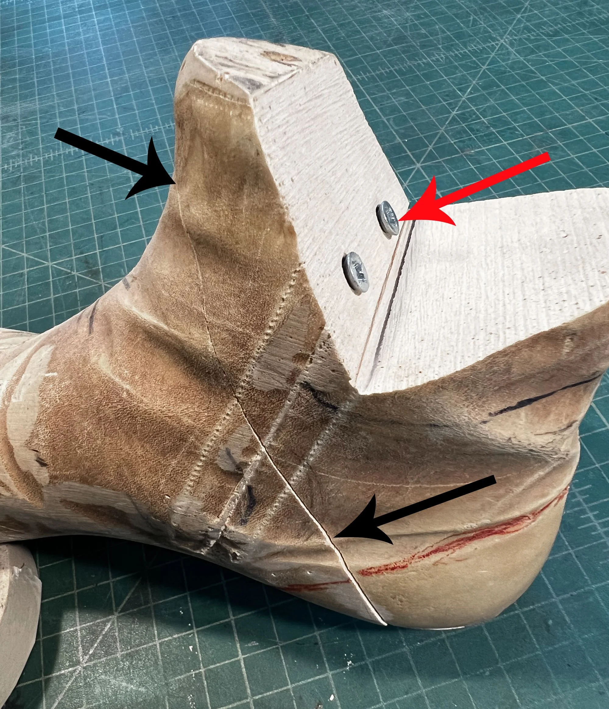 In order to be able to extract the last from the finished shoes I used a bandsaw to cut the last in two pieces (black arrows), and then held the pieces together with screws (red arrows). By removing the screws, I could pull out the heel section first, followed by the rest of the last.