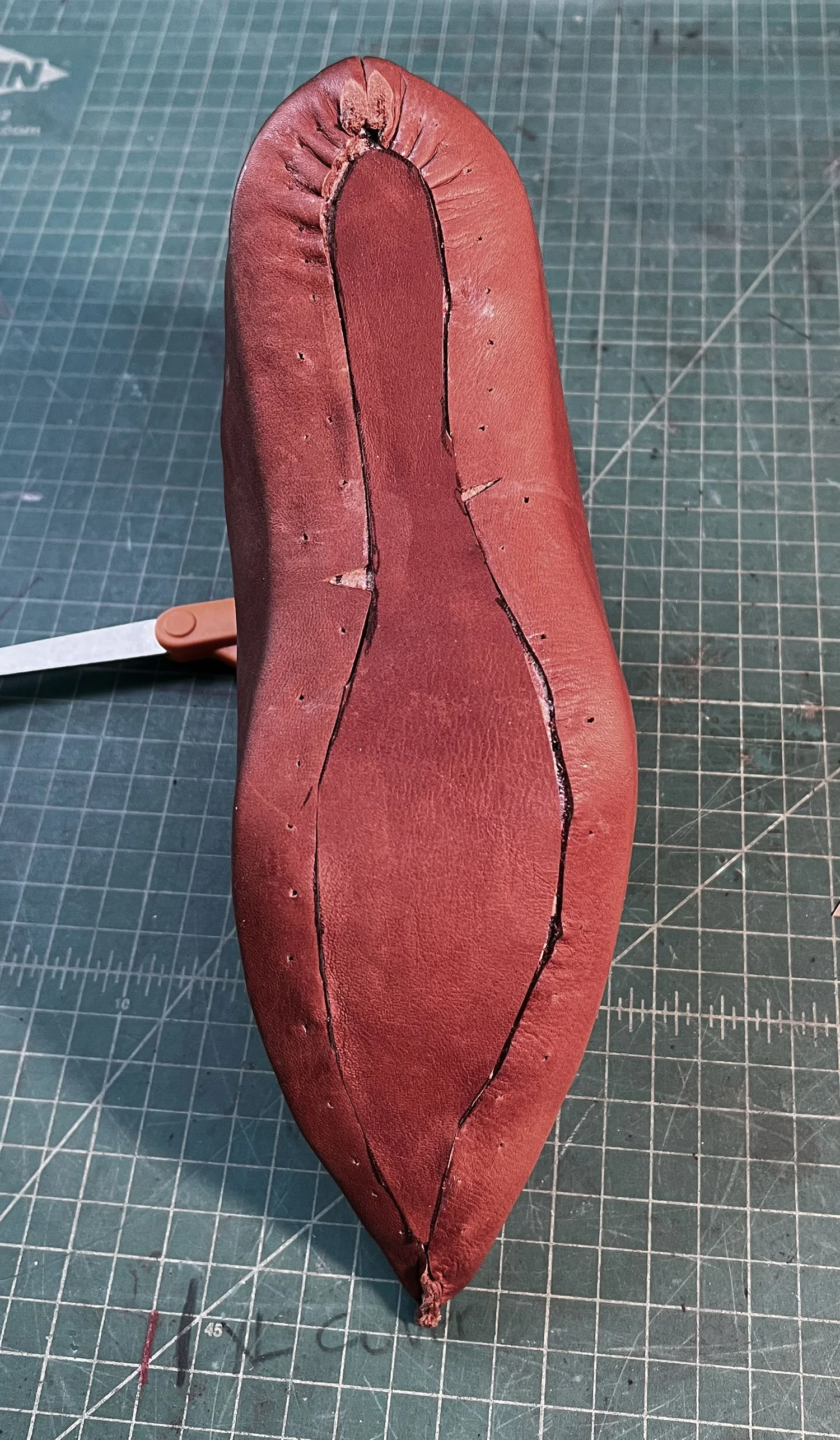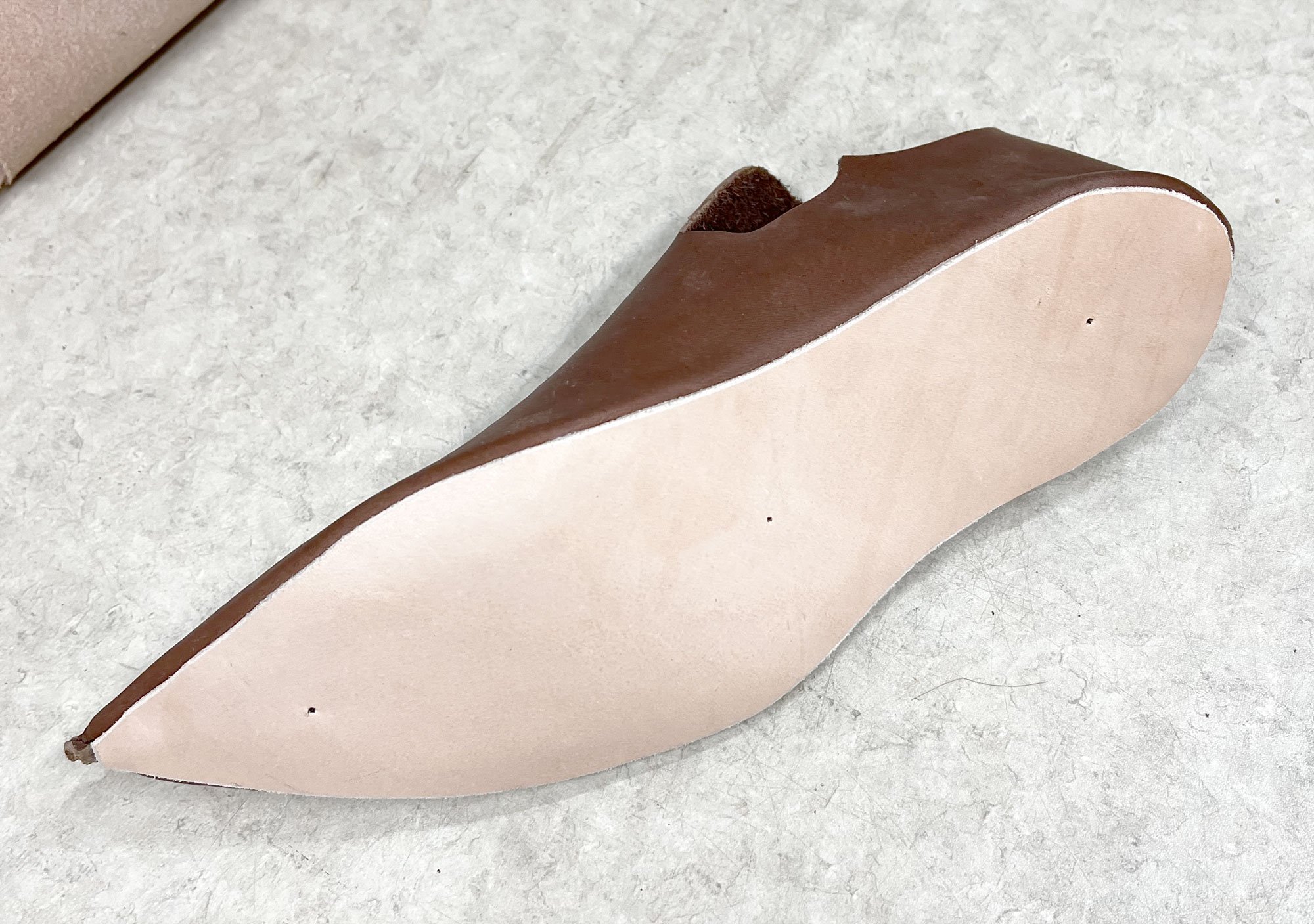 I used the insole pattern to cut another veg tan piece for the outer sole, and cemented in onto the bottom.