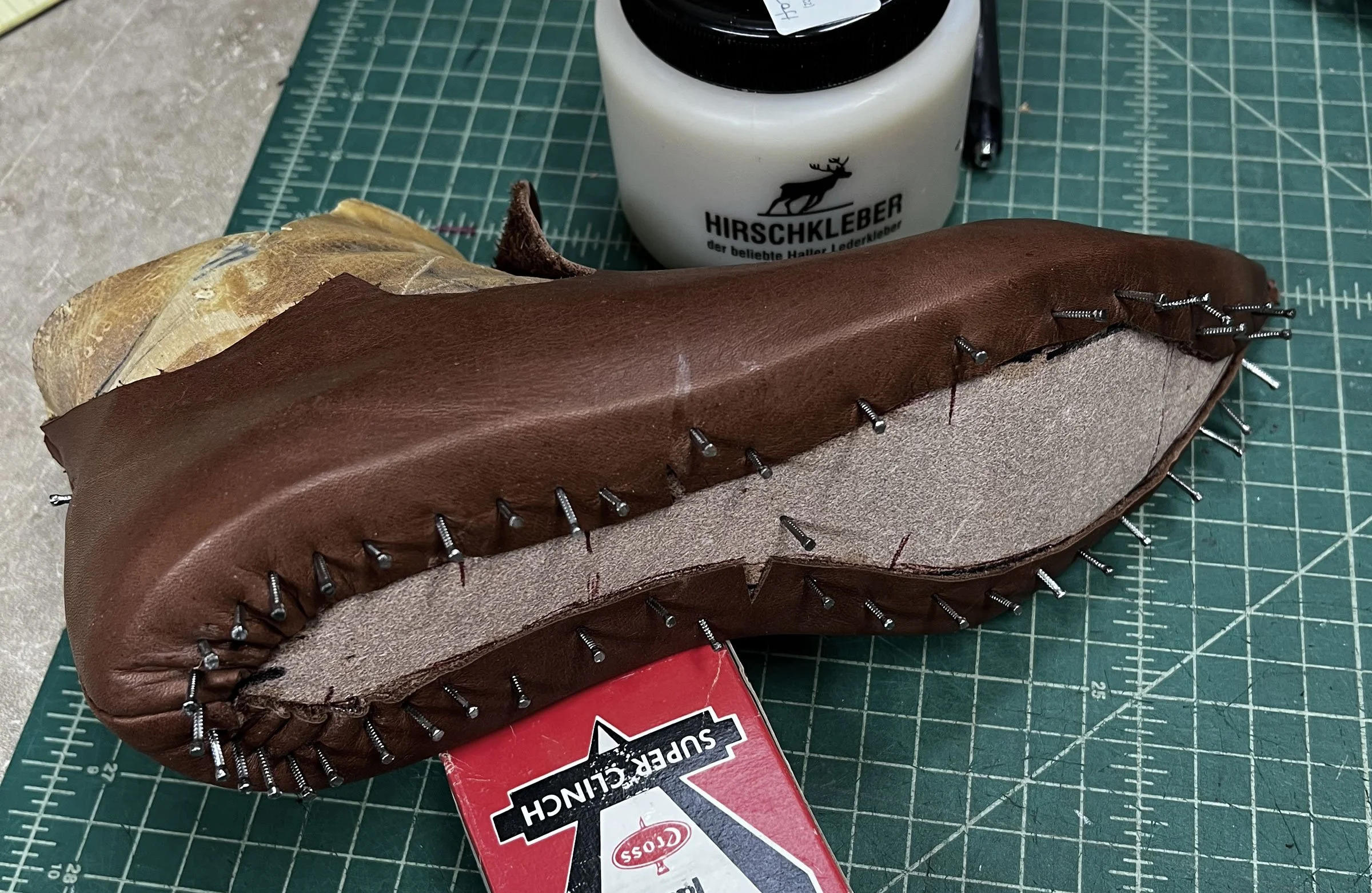 To construct the shoe, I began with the insole piece of 5 oz veg tan leather. After cutting it out I tacked it to the sole of the last.
