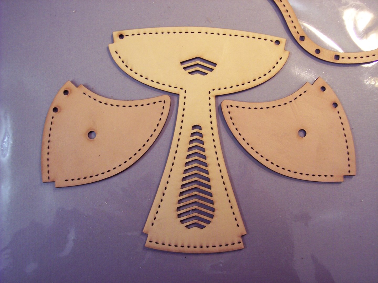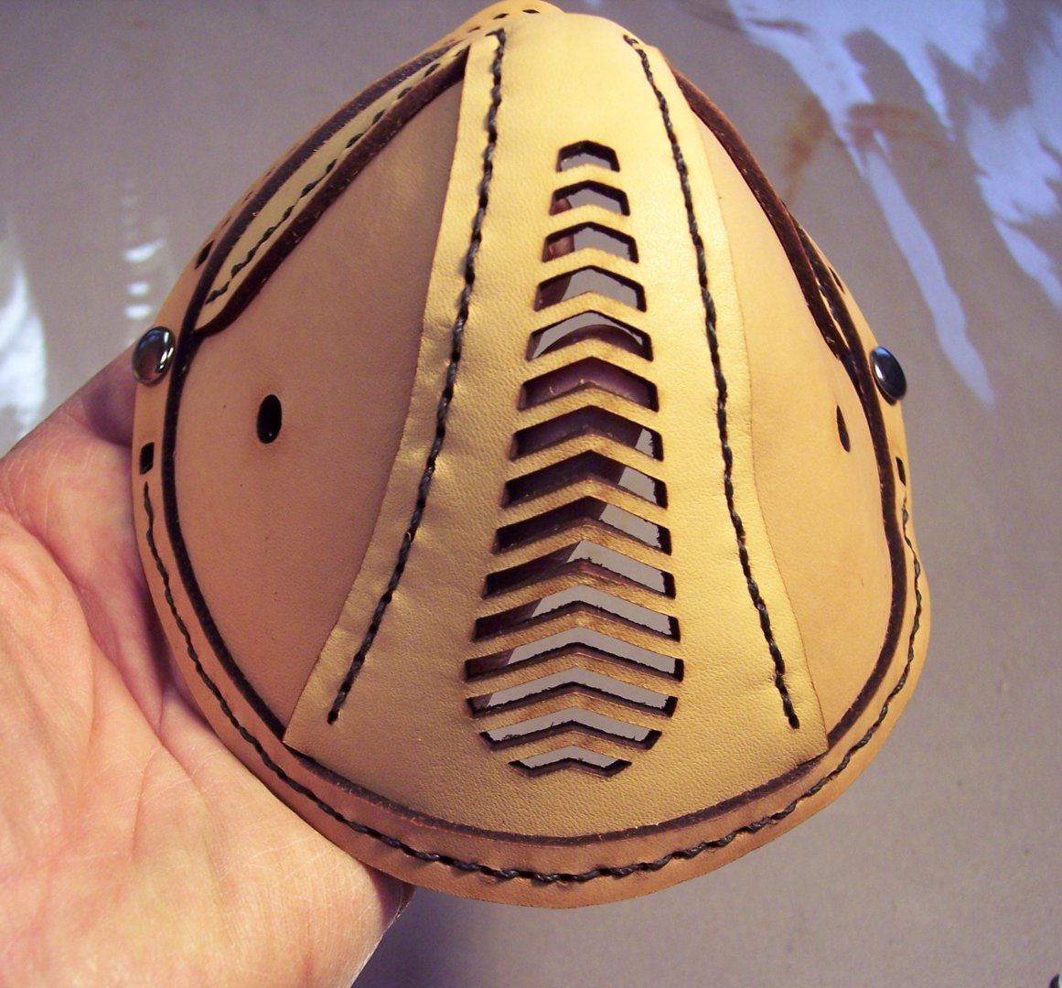 This tutorial is adapted from a workshop I lead at the Nova Albion Steampunk Exhibition in March 2011 in northern California. I am attempting to make this easy to follow and doable even for the novice leatherworker. The pattern pieces are all to scale, and include holes for rivets, slits for thread, holes and slits for buckles and a button stud, plus decorative openings for ventilation.