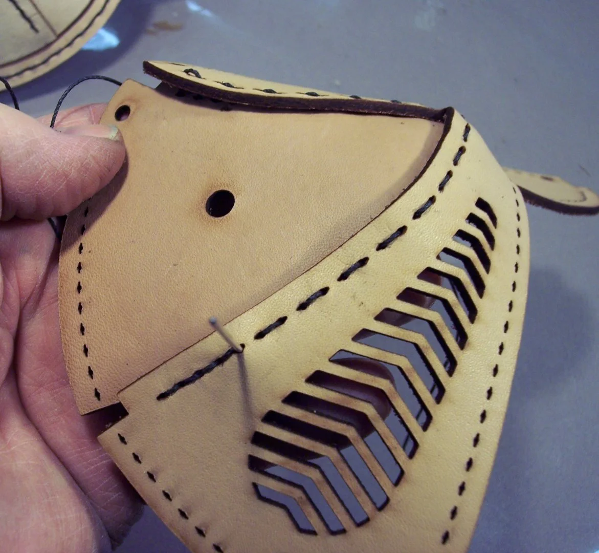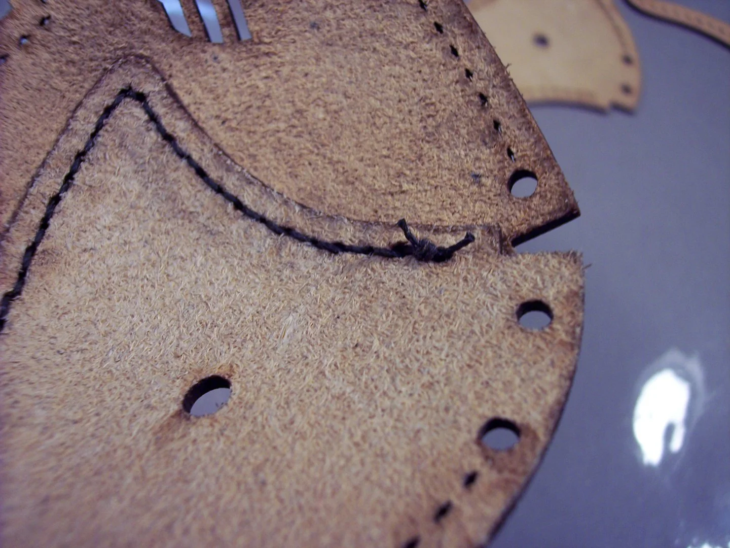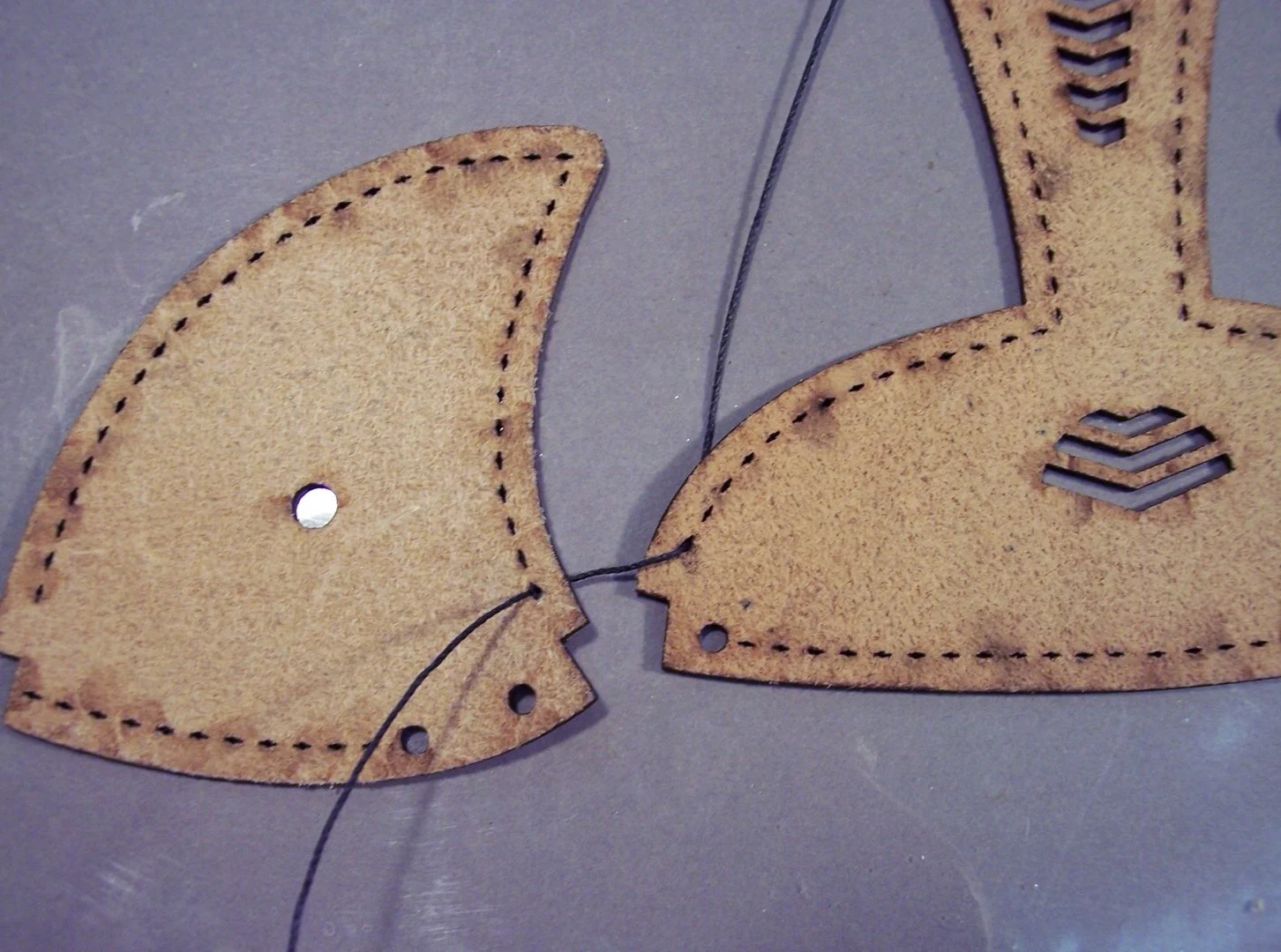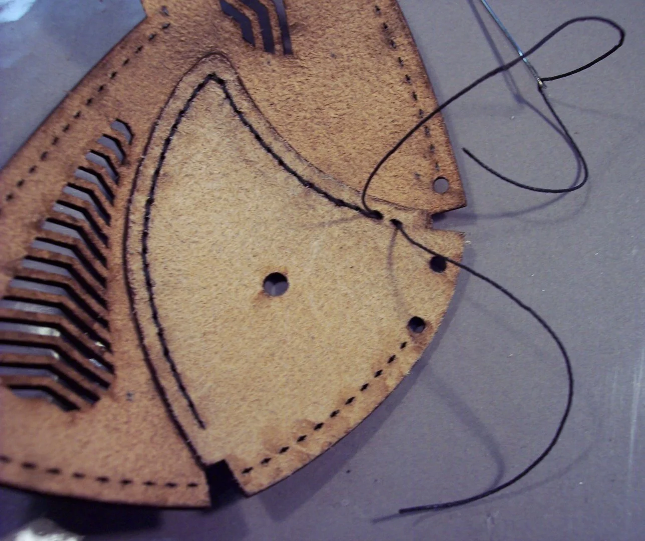 Stitch the bottom part of the surround to the mask using the same running stitch as before. Tie a square knot, then stitch top half of surround to mask. Tie off, then hammer two rivets flat.