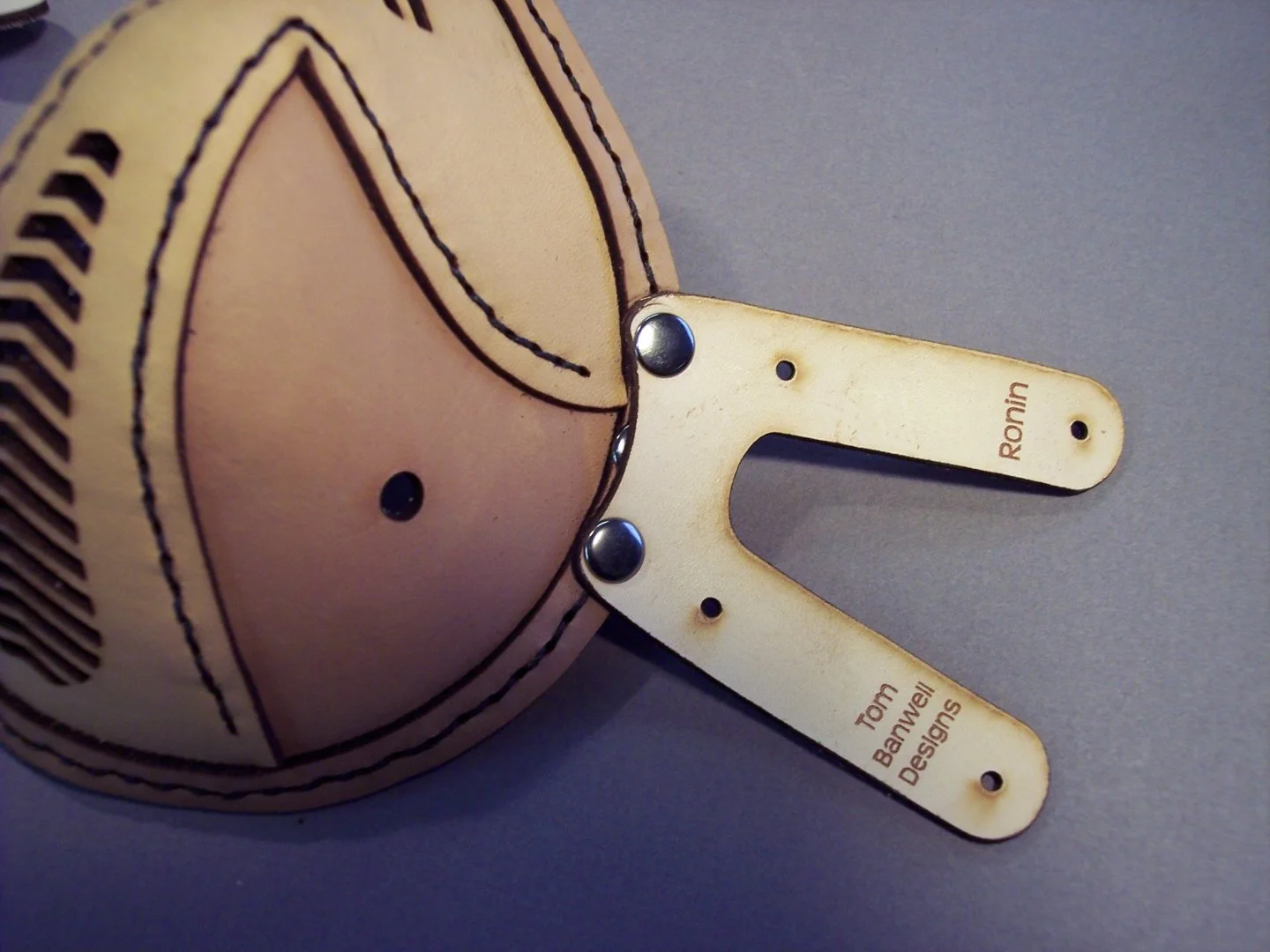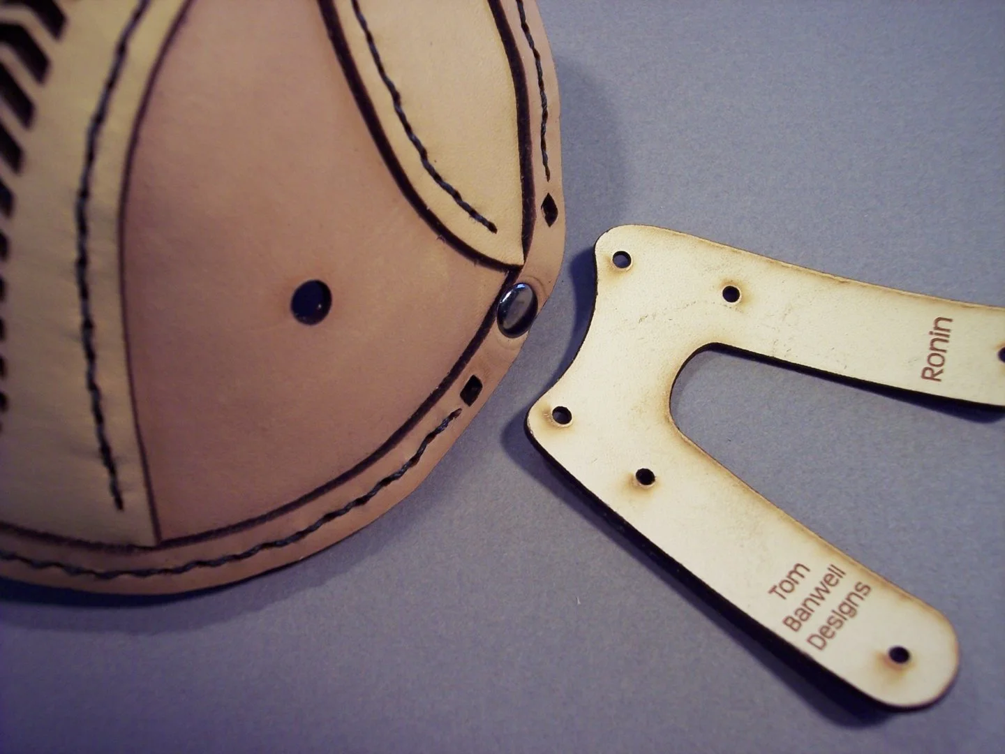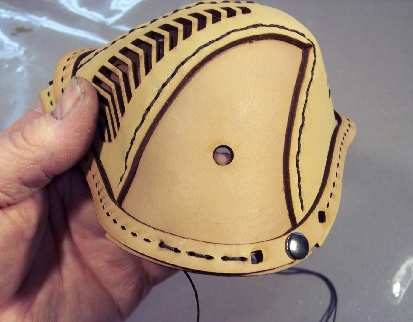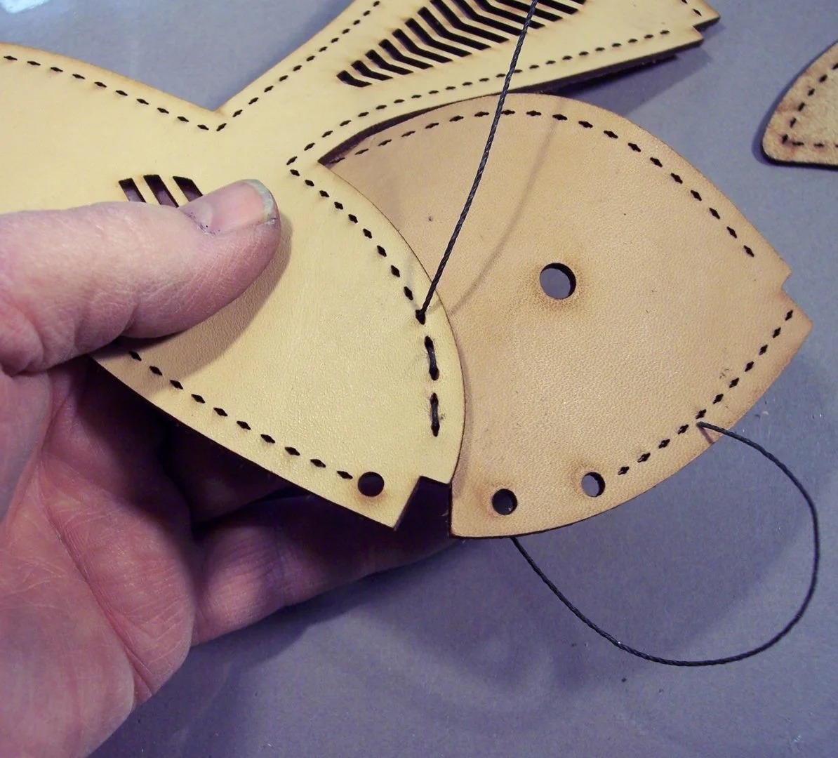 Stitch the bottom part of the surround to the mask using the same running stitch as before. Tie a square knot, then stitch top half of surround to mask. Tie off, then hammer two rivets flat.