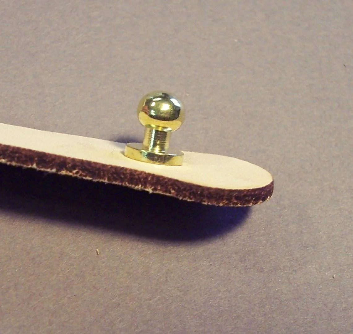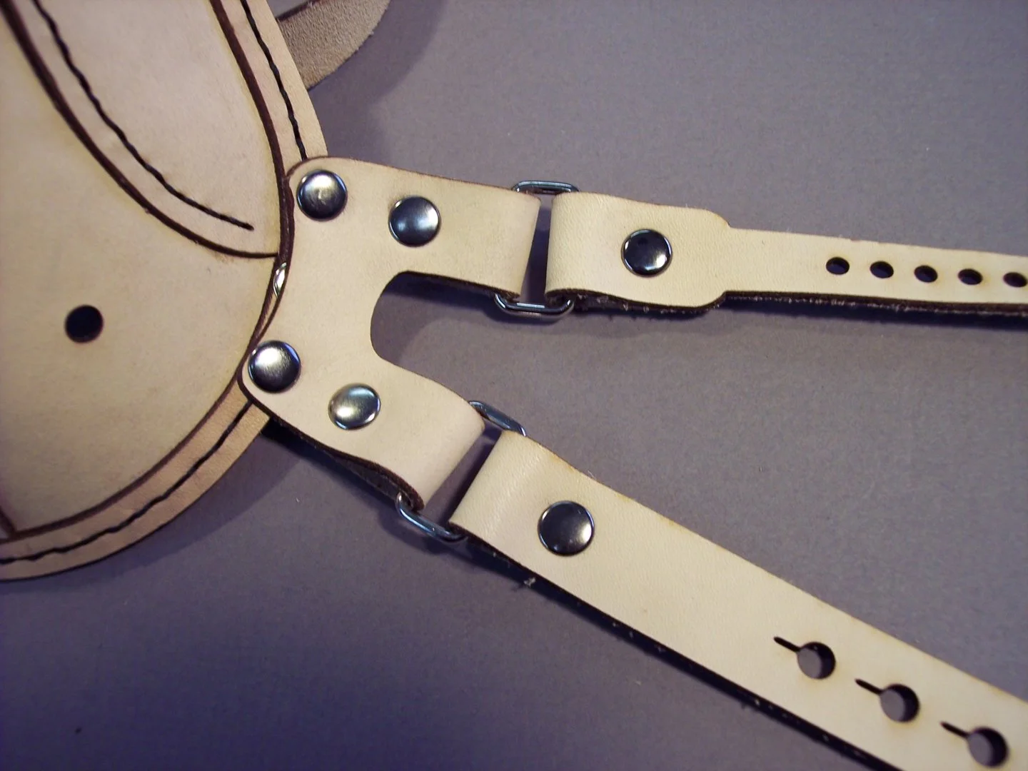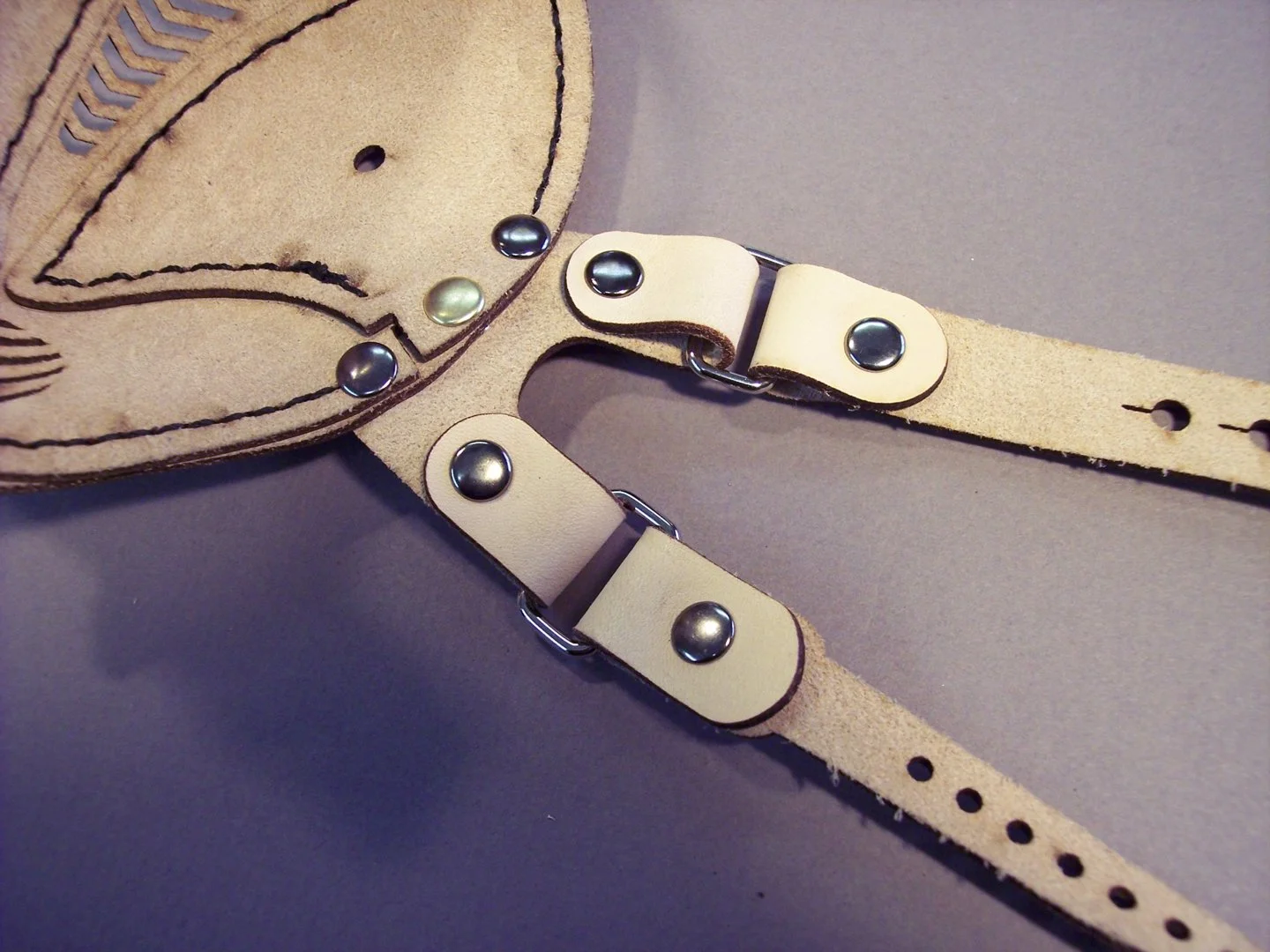 Attach button stud with screw to left lower side strap. Mark where button stud cover goes behind button stud and attach with contact cement. Fold upper and lower side straps over rectangle rings and rivet