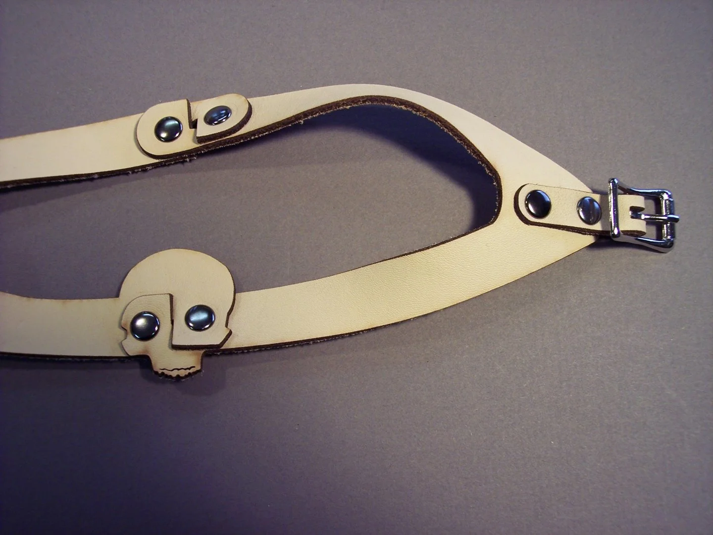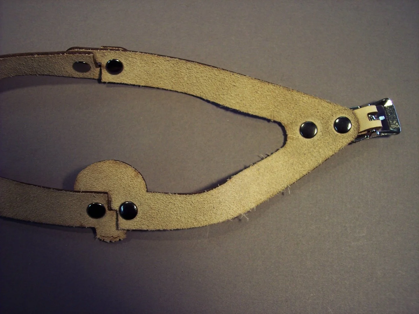 Attach two head straps to each other using four rivets. The free ends go to outside (grain side). Take two buckle straps and attach to ends of head straps. Round end of buckle straps goes to inner holes of head straps. Hand place rivets. Place two buckles over free ends of buckle straps. Fatter end of buckle goes to outside. Place rivets through two buckle strap holes and then head strap holes. Hammer all four rivets flat.